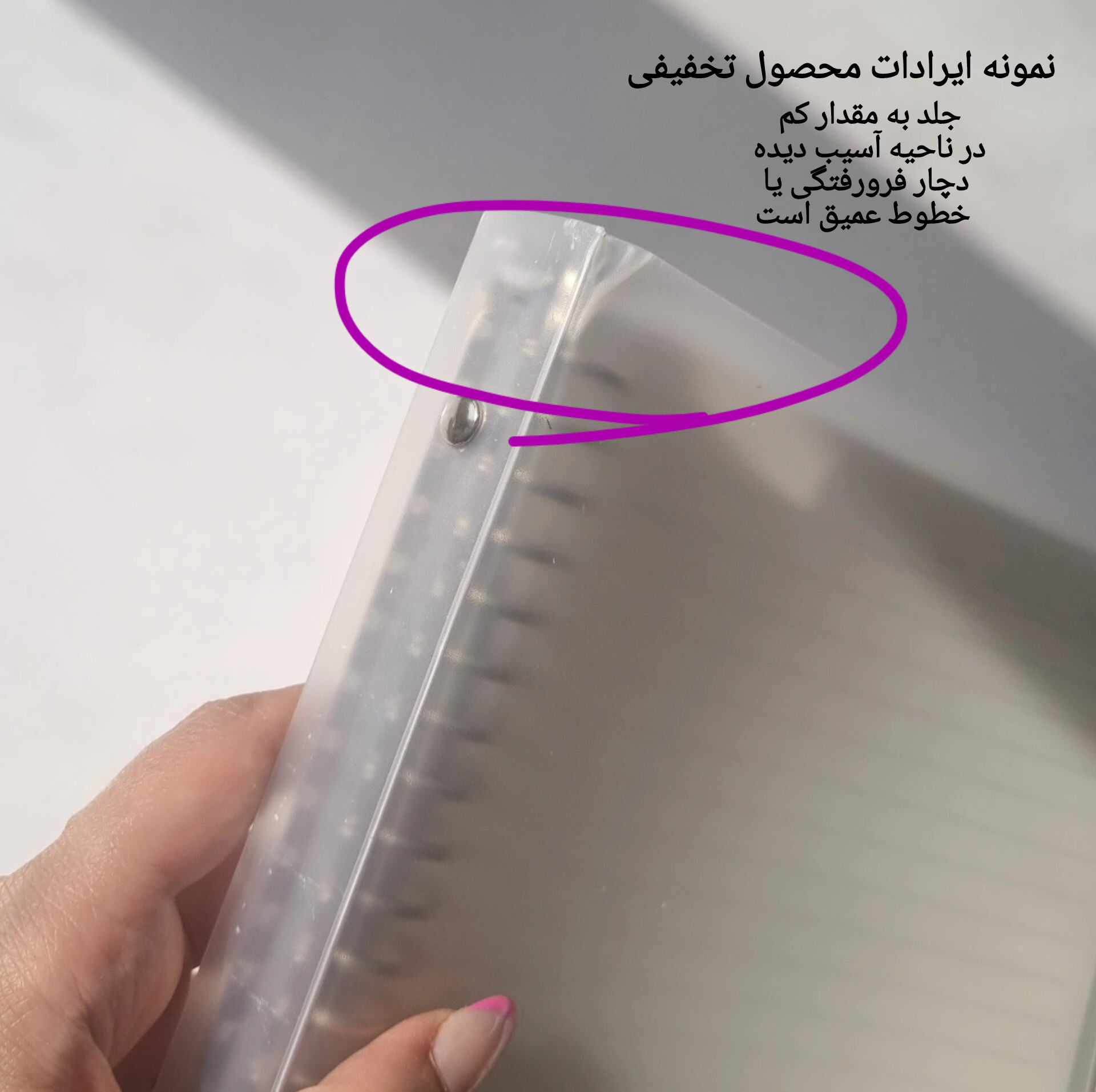 - در بخش گالری نمونه ای از خطوط عمیق روی کار نمایش داده شده است که ایراد محسوب میشود و مربوط به محصولات تخفیفی است که در صورت خرید از محصولات تخفیفی، نمونه ای به صورت رندوم با ایراد مشابه ارسال میگردد.